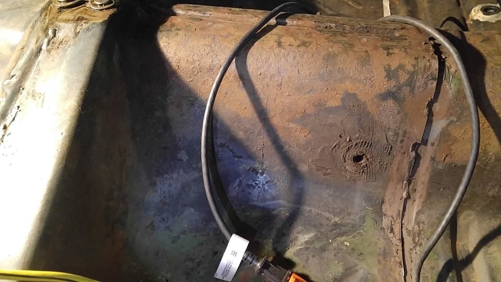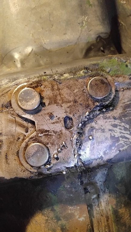 The drive shaft is four 7/16" or 3/8" bolts. Why not drop it and remove the dampener? Aside from that if you are considering what you just said, why not only cut out the small bad area and section in the new piece? The pics may be deceiving but it looks like the majority is fine. It's a toss up as to whether removing the whole thing and spot welding the whole pan in is more work than butt welding in a patch area. Myself, I would do the whole pan if I had it. I just did complete front to back pans in my Challenger and it wasn't bad at all.