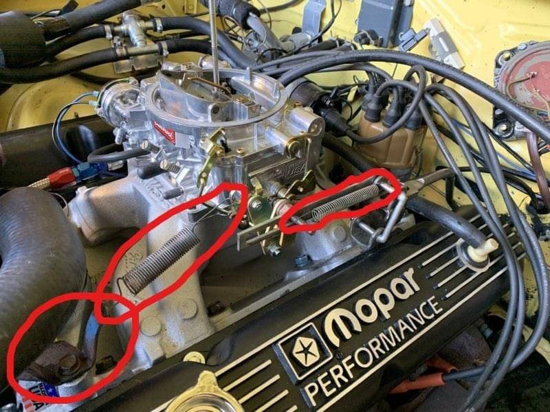 I have a 74 charger with a ld340 edelbrock intake on it. I have the kickdown linkage on the car but noticed that I'm missing some parts. I know I need at least these two springs circled but not sure where I can find those and I am unsure what front bracket to get as I have found two different styles as the one pictured according to ebay that I can see is 71-73 (rust color picture) and the 74 on up is a different style.(red bracket picture) any advice is appreciated