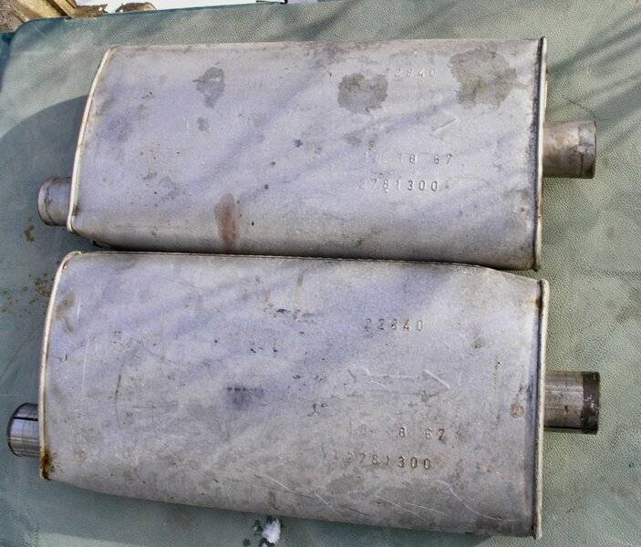 I need some help from the OEM experts. My 67 GTX came with what were identified as "Hemi Mufflers". I remember my first 67 (38 years ago!) had similar shaped mufflers and had a great mellow sound that didn't get in the way of the radio unless you punched it. The mufflers on this car are friggin' LOUD! Forget the radio, they bark at idle and go up from there with a bad drone at 35 mph and the threshold of deafness at 60 mph and above. Looking under the car, one has the pentastar, what appears to be a date code of 9-67 and PN's 22840 and 2781300. They look stock but definitely do not sound stock, at least compared to my memory. Here are my questions: