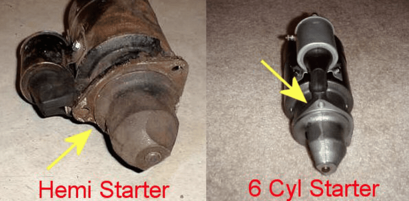 Okay... Differences.... Look at the hole that lines up with the solenoid, the Hemi one has threads, the six cylinder one doesn't... It takes a bolt... Also the casting is relieved on the Hemi, there is actually allot more metal on the six cylinder nose cone.... Look where the arrow is pointing.. See where the arrow points to a curved relieved area on the semi starter..