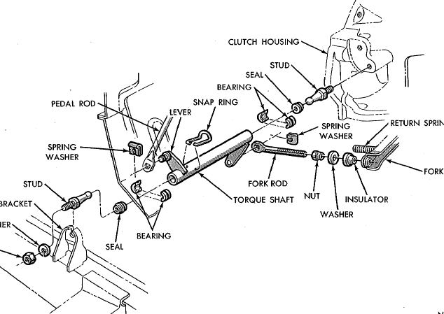 Back to the Z bar, unhook the return spring, remove clips and unhook the linkages. Remove the Snap spring, remove the frame ball stud nut and push stud in towards bellhousing. Then just angle it upwards and- bam done. The clip just orients the plastic bushings, and should be replaced frequently if you have heavier than stock clutch. Get a clutch shaft service kit, it comes with all new small parts-well worth it.