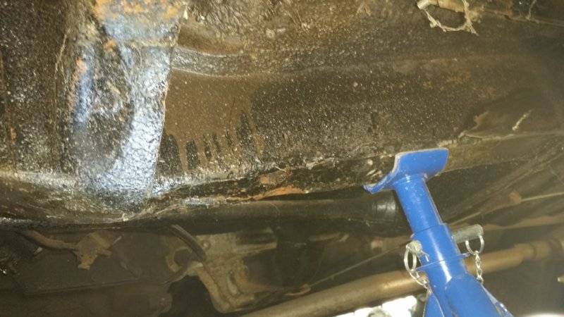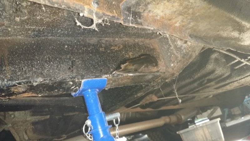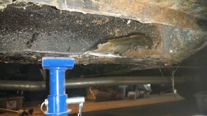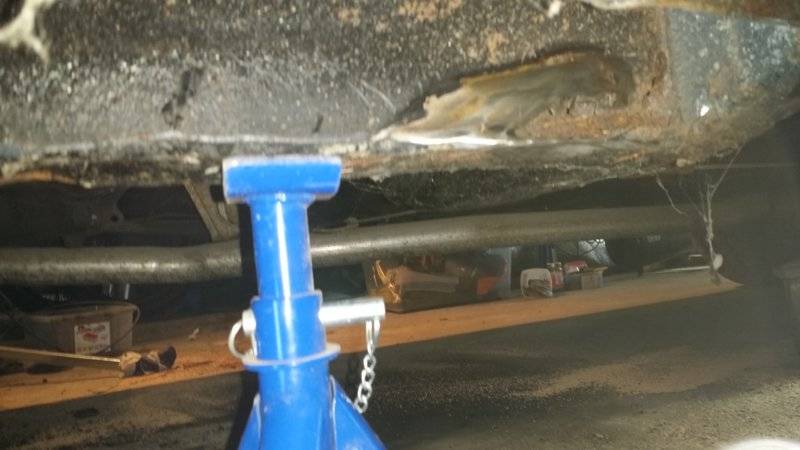 Today i wanted to bleed the brakes to check out why my brake warning light isn't going off. I started to jack the car up at the front driverside corner, and noticed that the subframe looked kinda soft when i was pumping up the jack. On closer inspection i found a hole in the frame, a welded patch and a frame that looks a little dented here and there.
