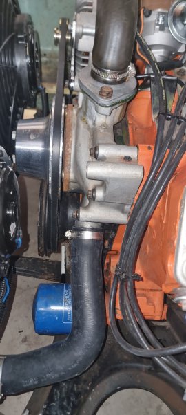 You have it backwardsI will tell you my experience put a bigger water pump pulley on it to increase the speed of the water pump. I had a customer we built a 512 stroker on pump gas, for a 4x4 truck and he wanted a serpentine belt system. The engine ran hot, swapped out radiators, high flow pumps, even took the heads back off and opened up the coolant holes in the head and block, changed to a bigger pulley problem solved. just use a stock A/C water pump. From your picture the pulley looks small to me.
