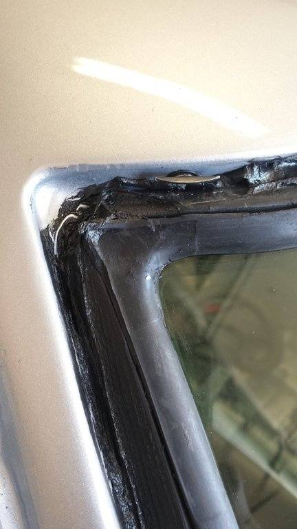 Close up of the transition of the gasket from "sitting on" to "tucked onto" the pinch weld seal. Sealer goes up past this a few inches...