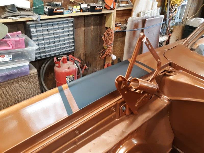 No, it's Copper Metallic over Dark Chesnut Metallic which makes it a rich dark copper color. The front end will drop when the hood, engine, trans are in it. Or I'll lower it some.Kinda curious to see the rest of those stripes. Is that the modern GoMango?