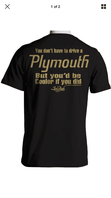 I bought that exact t shirt at the Minnesota car show from a vendor. It’s cool! Says Plymouth on the front.Kinda like that one, where did you find it?