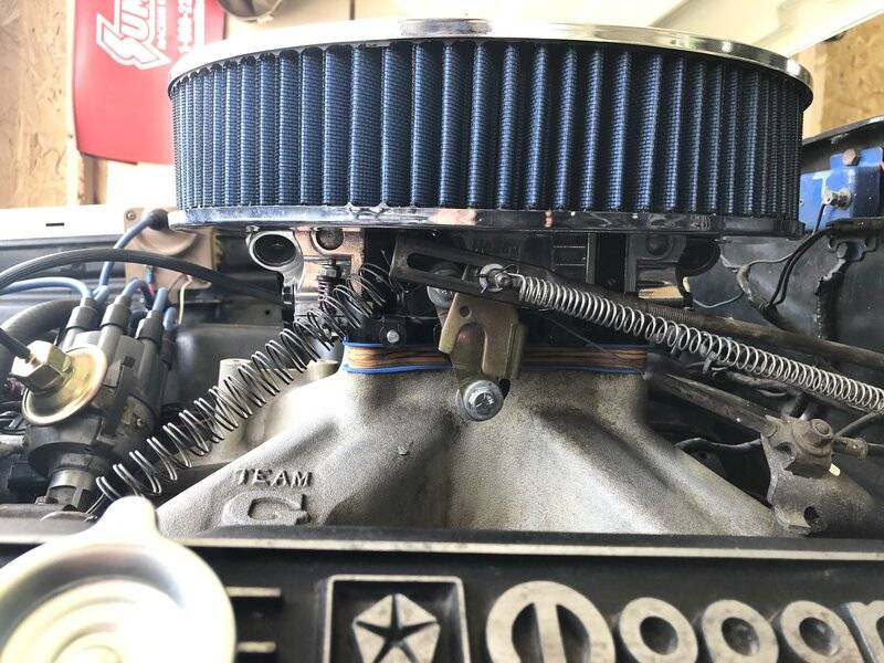 The new problem is while I was at it I put a 1/2" birch spacer between the carb and the intake and although the hood still (barely) clears I think the angle of my kickdown linkage is now too steep. I already have a Weiand Team G intake that I think is taller than the stock intake and kickdown was working fine then. But now when I tighten the air cleaner down too much the slotted linkage hits the bottom of the air cleaner and wanted to get hung up there a couple of times; if I don't torque it down too much it seems fine. I am going to attach a couple of pictures and see what people think. I was tempted to just bend the threaded throttle kickdown rod connector so it would sit more horizontally, but I'm sure that isn't the right fix. I could just take the spacer out, but it's already helping with a hot start problem so I'd rather keep it.