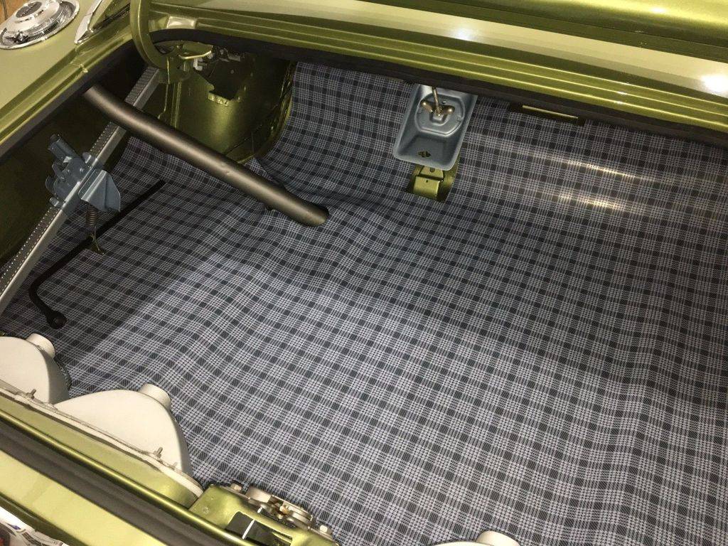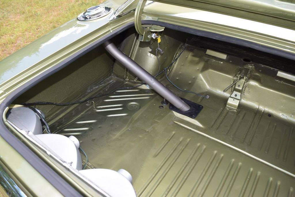 Replacement trunk floor without drilling out the body plugs or just painted over the body plugs? It's missing the wiring hold down straps on the quarter extension, broken fuel sender wire. Either the quarters have been replaced, or something has been done to them. Note the brushed on shmoo.