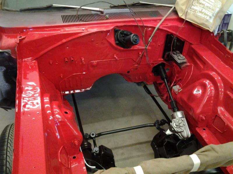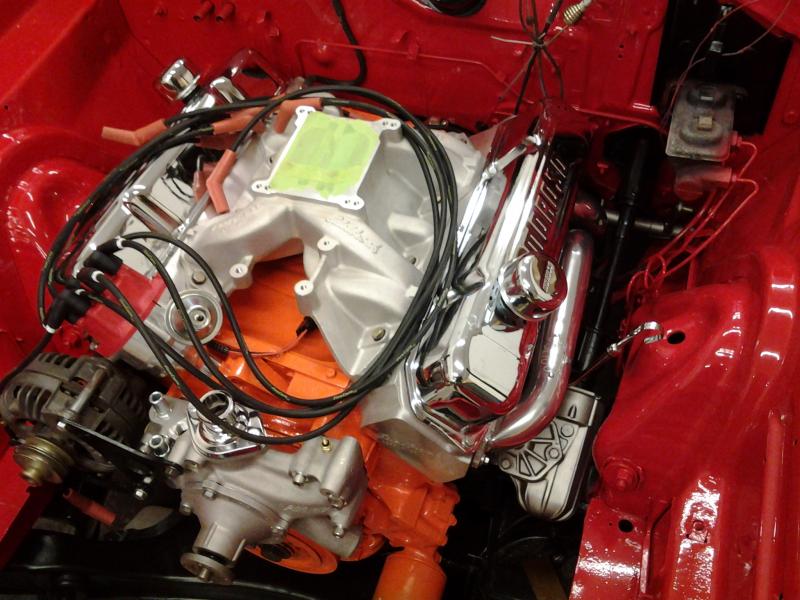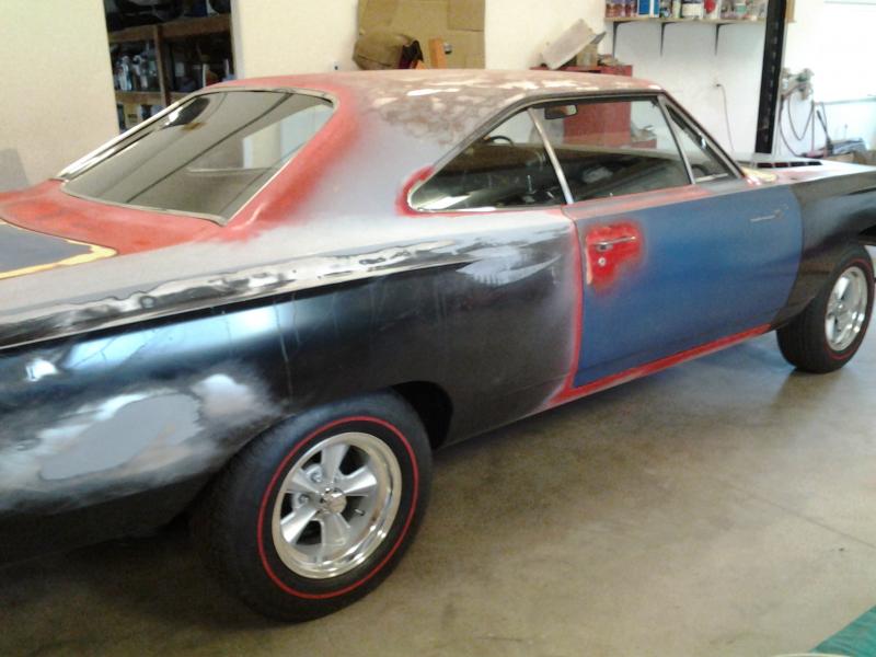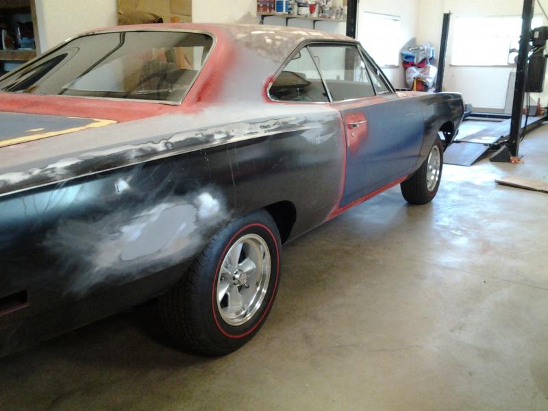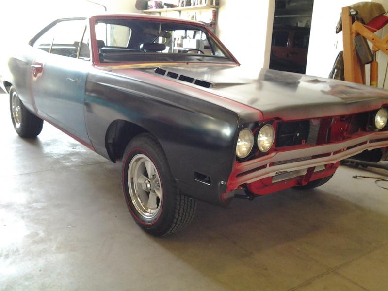 First I removed the front end, rust had taken out both fenders and the hood, cleaned up the engine bay and installed the 440 and four speed, then changed the floor halves, then new quarter panels and new front end. Then rebuilt the rear axle, moved on to Borla 3 inch exhaust, painted the door jams and trunk (never do that again) I can still taste the paint. Recently got the wheels and red line tires. After breaking one windshield we'll have the pros do the next then we can get back to finishing the Torred (red) paint job. The car came with 69 charger seats so I stayed with that upholstery, the back seat is original, the buckets are recovered with a PUI Leather/vinyl kit. More to come after paint.