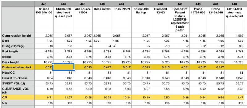 Here are the pistons I considered when planning my 440 build. Notice most pistons are designed for 0.015 to 0.017 in the hole. While planning, I made a spreadsheet to keep it all straight. Use this for your reference, but all numbers should be verified, as i easily could have made a mistake.