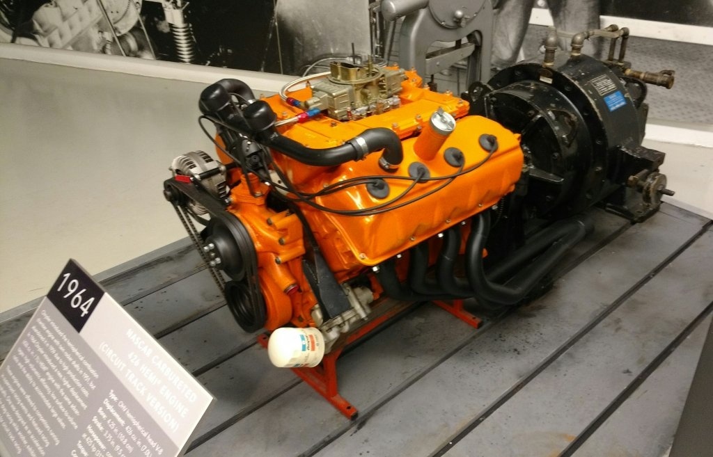 Here is a 5.7 Hemi cutaway model next to a beautiful aluminum block slant 6.
