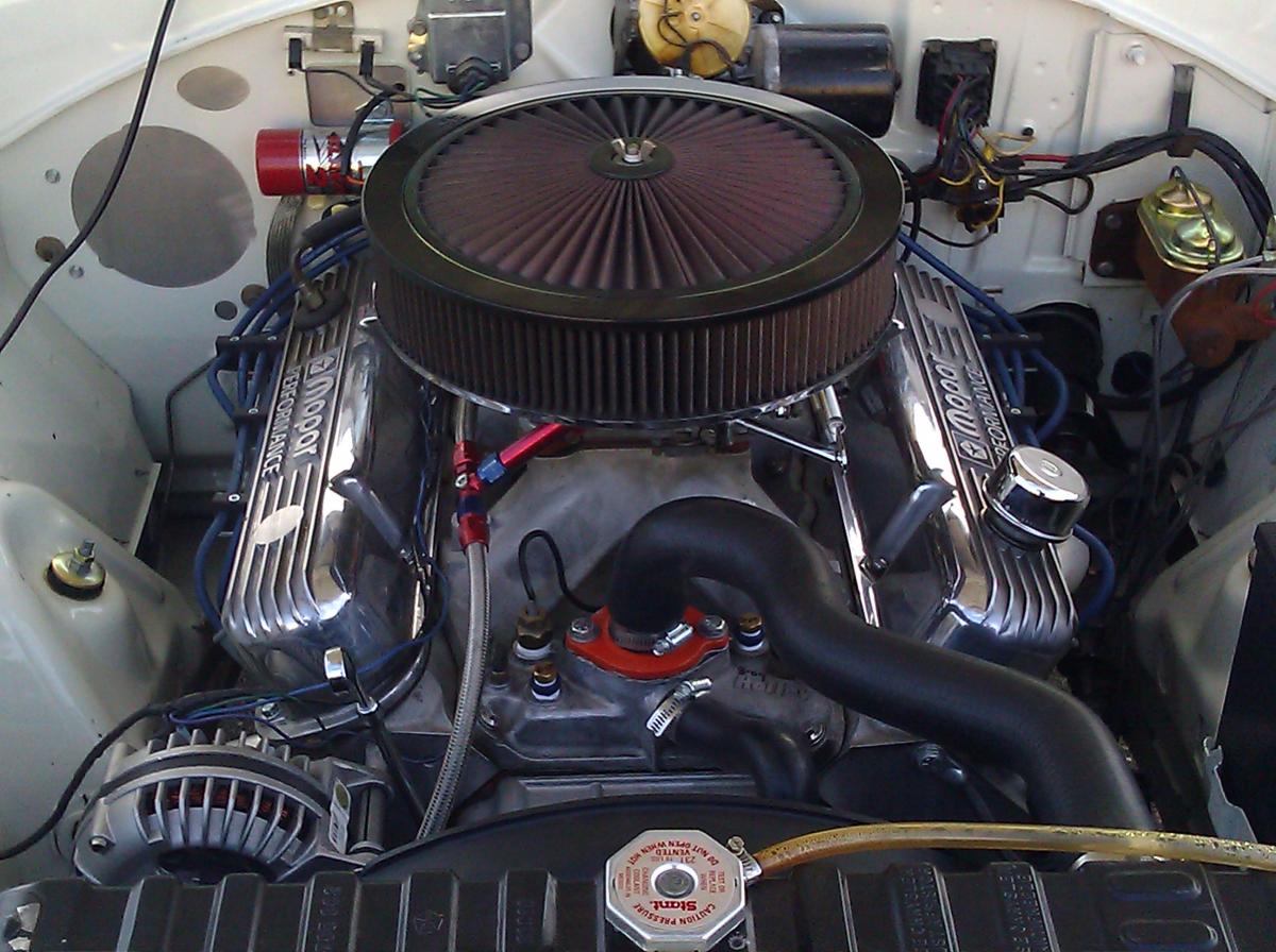 The Engine is a 400 block stroked to 500" (4.375x4.150) about 12.4:1 compression with flat tops and Edelbrock Max Wedge Victor heads, Indy 400-2 intake and 4150 style Holley HP, 1,000 cfm carb. 14"x3" air filter with K&N filter top, 2" hooker headers into TTI 3" exhaust. 264/264 @ 0.050" HXL Comp cam, 0.714"/0.714" lift with 1.6:1 ratio T&D rockers.
