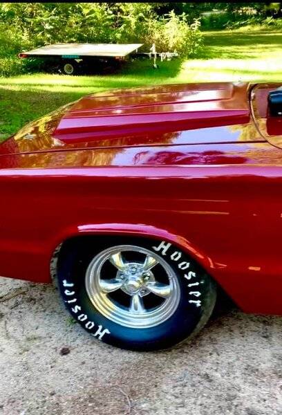 wheels are American Torque Thrust 2, 15x3.5, Tires are Hoosier front runners 28x4.5x15. I had a Mickey Thompson DOT front runners that were 26 inch tall and it never looked right. Wheel wells on those old Mopars are big, need a tall tire to fill them up.