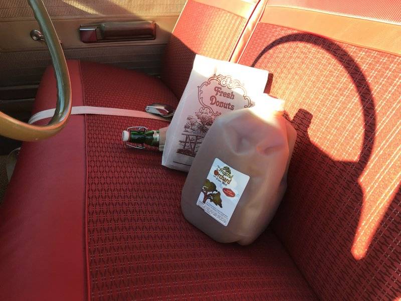 I see, donuts. cider and a nip.Other side of the doughnut bag