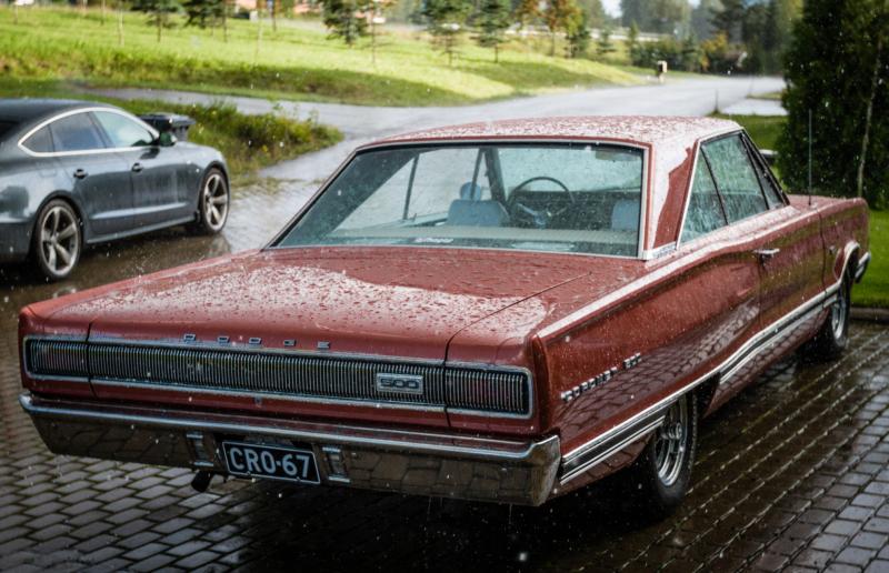 Here is my Coronet 500. I have owned this car since 1980, and am the second owner. The scheduled build date was 1 September 1965. It was bought new at Skyline Dodge in Denver in January 1966. The Coronet has a 361 auto, with factory tach, woodgrain wheel, air, AM, power brakes and steering, clock, and more. The pic with the wheel covers is the most recent. The other is one I took while the car was in use for a movie shoot in Oklahoma in February 2011.