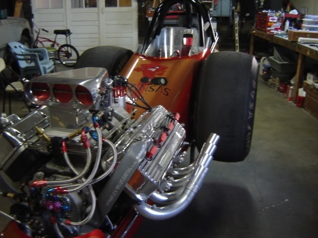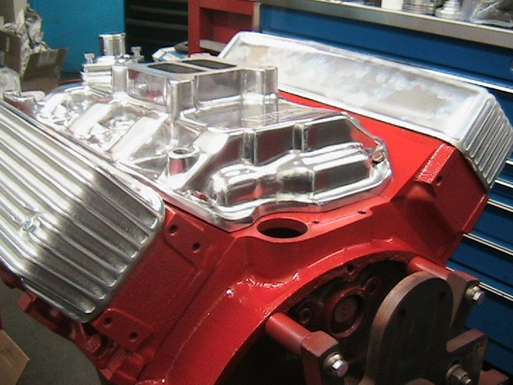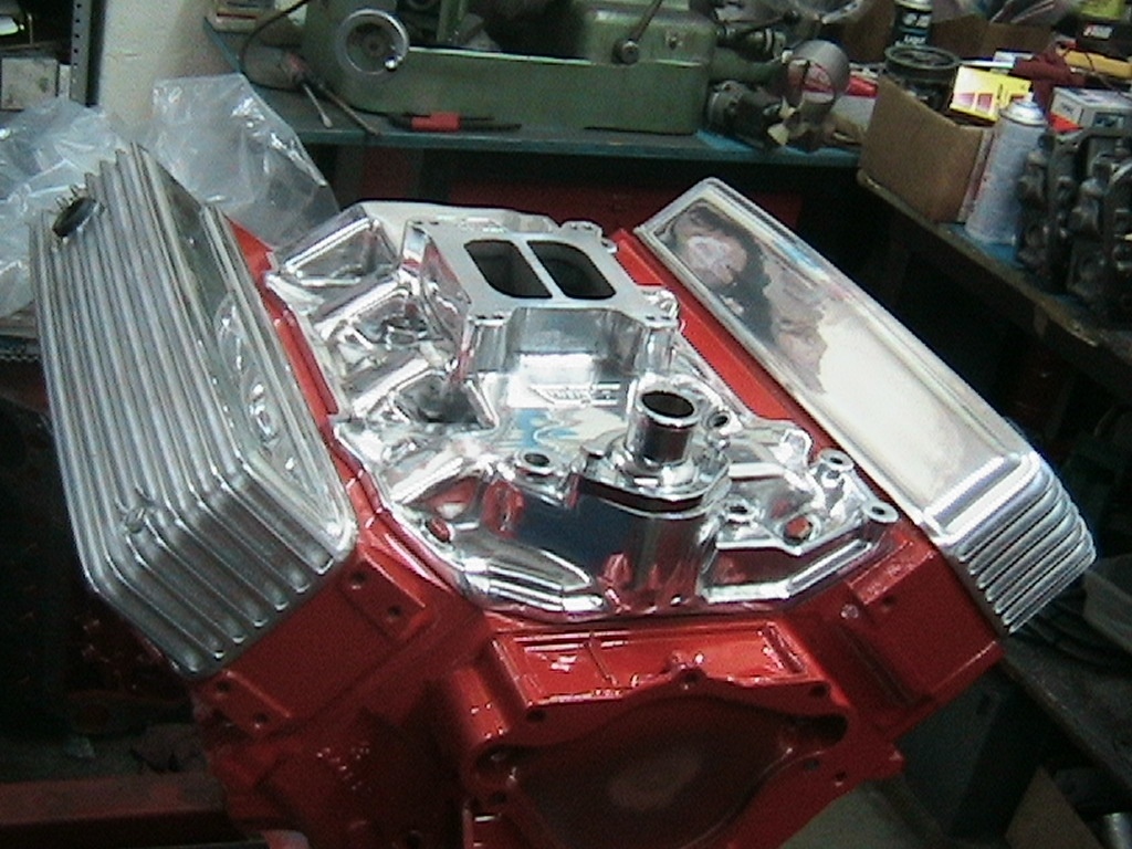 '66, bored .040 over, ported heads with 2.02/ 1.60 valves, '62 cast iron 4bbl intake, Edelbrock 650 avs and 1" phenolic spacer, original cam ground by Schneider to .462 lift 262 duration, TTI ceramic headers and complete 2 1/2 dual exhaust.