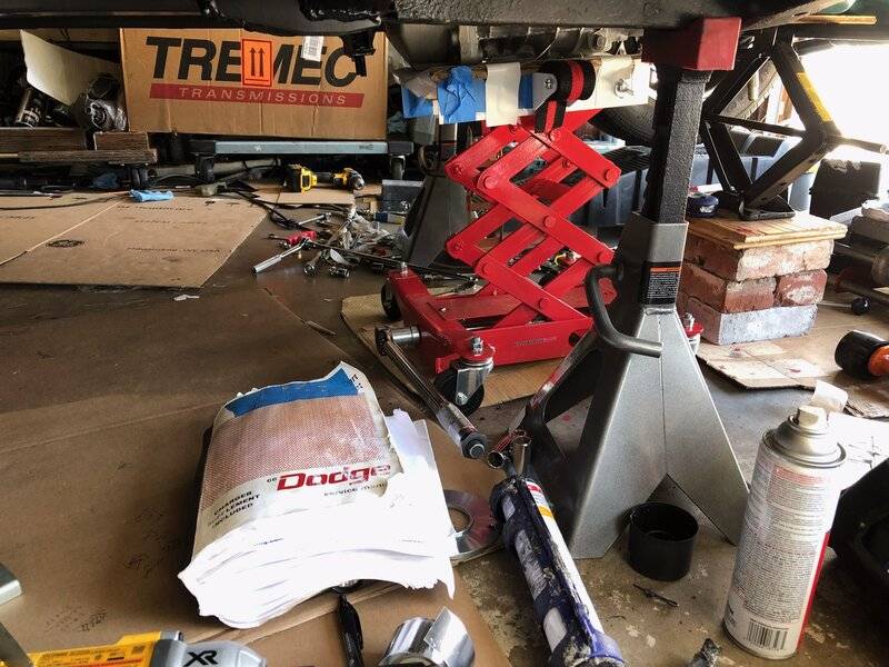 Now, from a garage floor I was barely able to pull that thing out. because the torsion bar piece I left in. My biggest concern is HTH am I'm I going to raise that thing back up on the trans jack? Coming down is one thing.