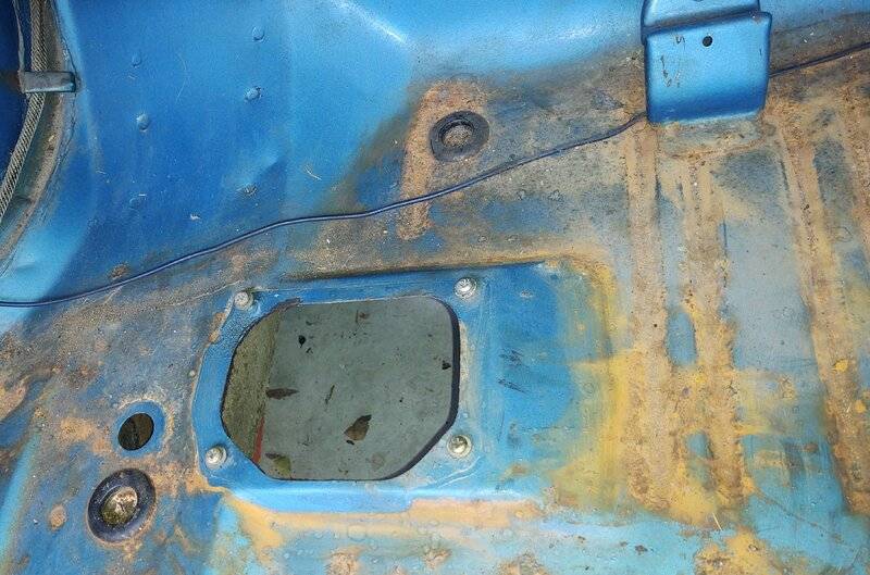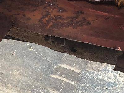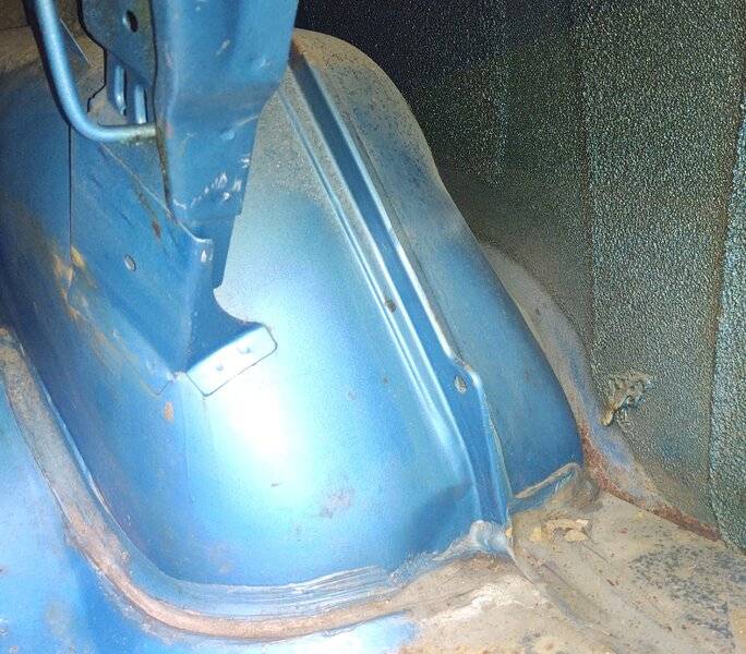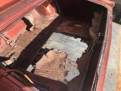 I am going to lay the new panel on the inner flange of the frame rails, atop the rear bumper support at the back and at the factory seam on the axle hump at the front. This will allow the panel to fit through the trunk opening and if it goes as planned, it will look original.