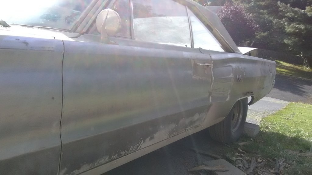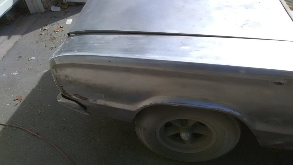 got most of the drivers side today got the dam flu so I didnt work and their is no way I can ride the sofa 2 days in a row I did find two areas with some bondo in them one in rear quarter and another in front fender the old timer I got it from did say he had a fender bender back in early 70S the metal is still sound under it tho