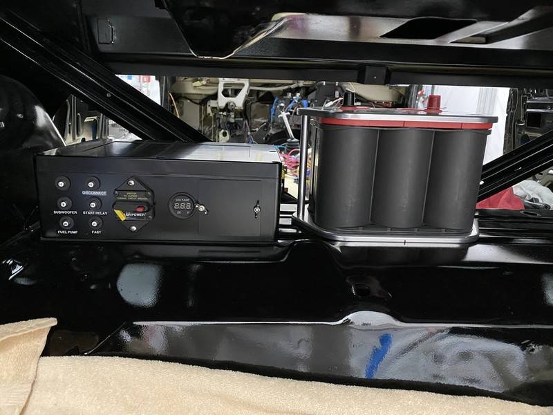 Trunk mounted battery and breaker box installed. I still have a lot of wiring to do but making progress.