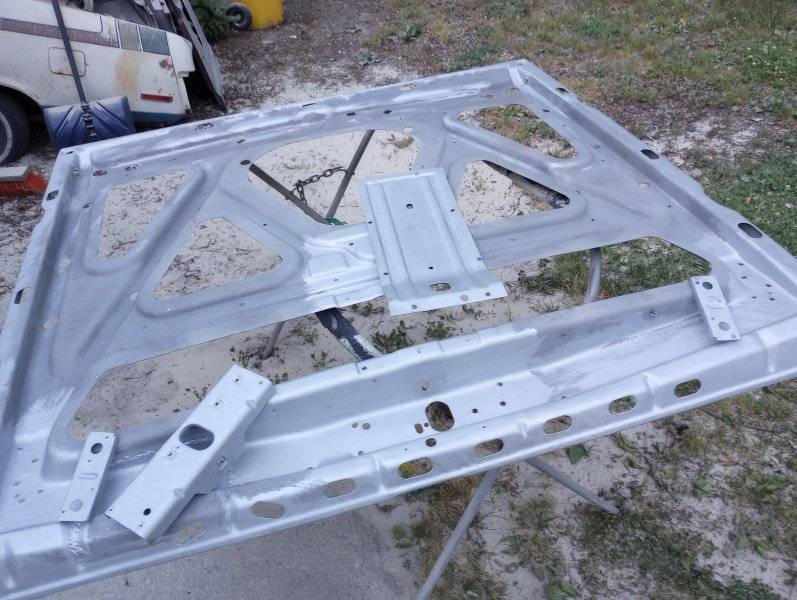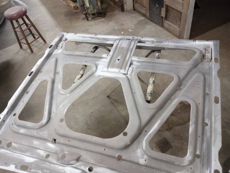 the hood is back in one piece, I sand blasted the frame and epoxied everything........ I also used ospho to clean up the topside of the hood and fenders