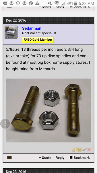 Also if you want to upgrade to disc brakes in the front, all you need to do is find an F,M,J body car in the junkyard and take everything from the spindle out. FMJ body cars are 76-81 plymouth volare, dodge Aspen, and 1970s diplomat, or lebaron RWD, and 1984-1989 diplomat, fury, new yorker RWD and fifth avenue. You will need B body disc brake lower ball joints. Your stock upper A arms will bolt right on to these FMJ spindles, ditto for the B body disc brake lower ball joints