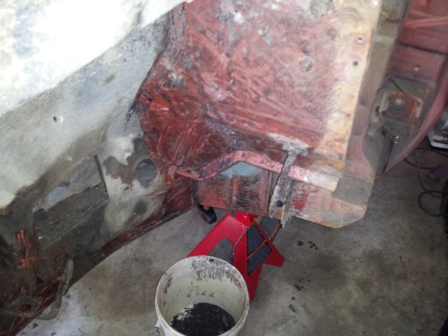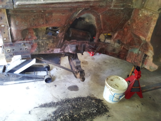 I must have really been in the zone . . . here it is, before lunchtime, and the driver side is all cleaned up ( I know, this is NOT helping you with your plan to get the K-member dropped ) but removing undercoating is so much fun, when the mood strikes, you let it go ! ! !