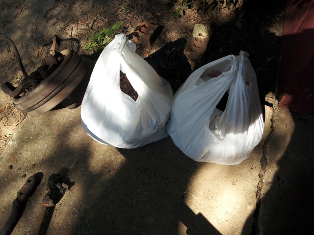 In case you thought I was kidding, here's (2) bags full of (2) buckets full of junk that has been removed form the car . . . at the end, I'm going to weigh them and find out the grand total of junk removed . . . should be interesting.