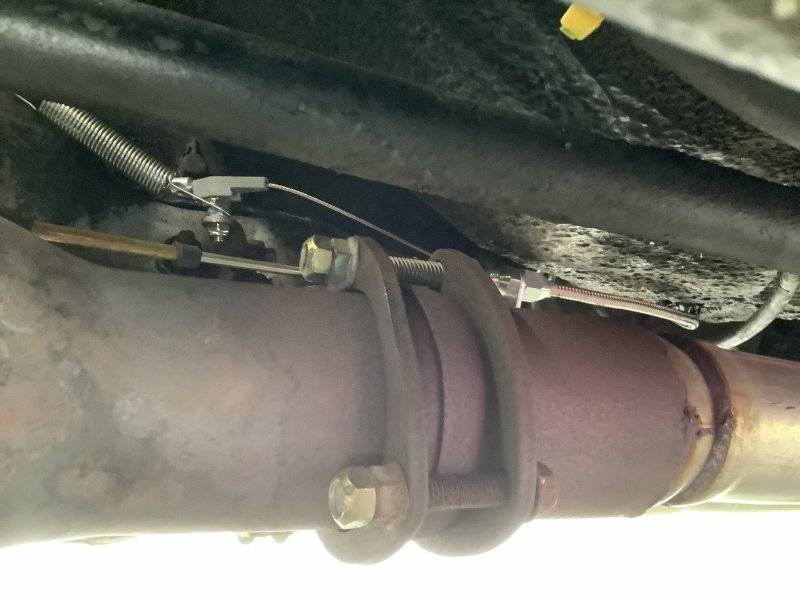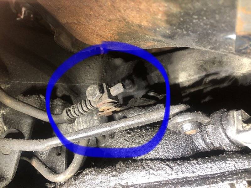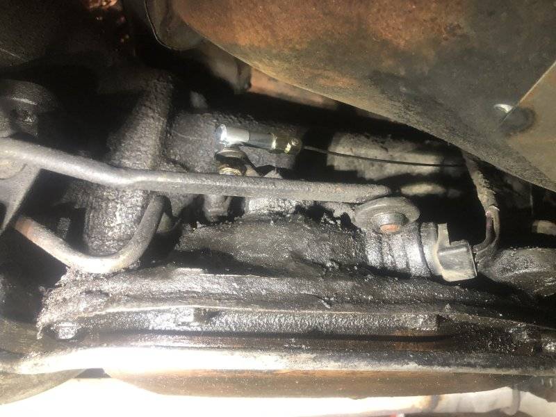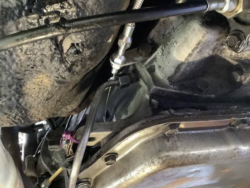 Poked my head under the car, and spotted the end of the kickdown linkage/rod. The factory one is attached to this arm on the trans here...