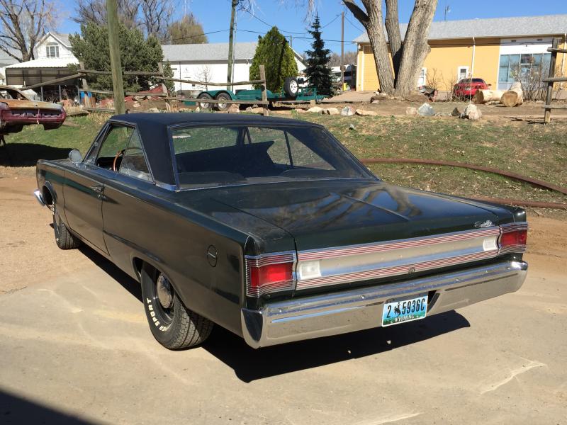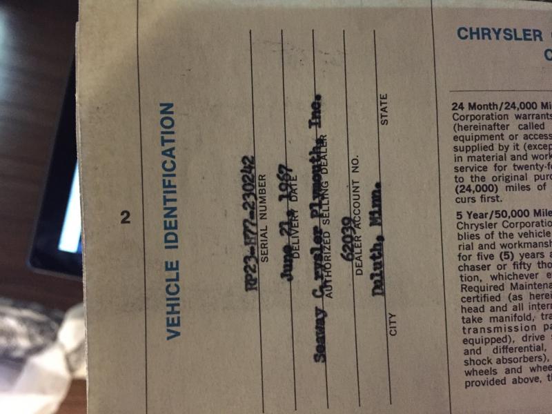 Ok so i have a 67 Satellite, its originally a 383 hi-po 4 speed car, buckets , no console but has a buddy seat that bolts between the buckets . its still with he car after all these years . has the original owners manual with the first three years of maintenance written in , also dealer info , date of delivery etc , i talked to the son of the original owner and get this , in the owners manual maintenance records Sept 1969 at 32k miles it says (new Engine) thats all . So the guy tells me his Dad loved the car but his brother got a new 69 GTX to show him up on friday nights. ANd blew his 383 witch i got with car too. He went to Seaway Plymouth in Duluth Minn, and orders and had installed a 1968 or 69 440 HP cost him 470 dollars (whew!) anyway he passed some time back and his son owned the car for 16 years. he had the 44 hp freshened 3k miles ago , it has 906 heads , forged flat tops , forged crank and rods and a 440 super commando cam. Sounds great , new clutch blah blah blah, anyway i will be sticking my hemi in this car so the 440 will be up for sale soon here are the first pics of my thread