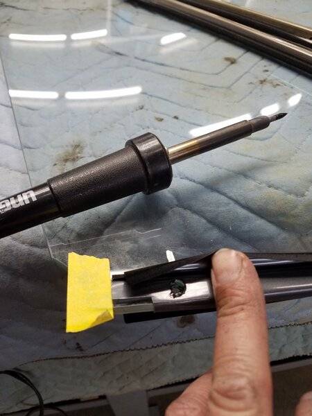 3 day weekend spent on windows. Picked up a pair of the very hard to find and expensive 029322230 vent wing run channel guides from a member here last spring. This was before the new run of reproductions were available. I will say these are very nice compared to the junk ones that were previously reproduced. Used an old one for a pattern to snip the ends to the correct contour and length. I use a solder iron to make the holes. Tried a punch on the terrible repro's on the last car and it split the mylar, ruining it and I had to buy another. These originals seem to be a better quality and would probably be ok punching, I was just to scared to try. I reused the white plastic guides because the new ones don't fit without modifying.