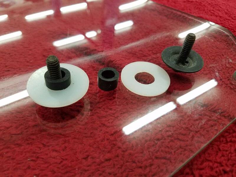 New vent wing gaskets, and ready to install. The easiest and safest way I have found to install front assemblies is to first drop in the vent wing. Then take out the small screw at the very top. Gently pry the top apart enough to slide the glass down.