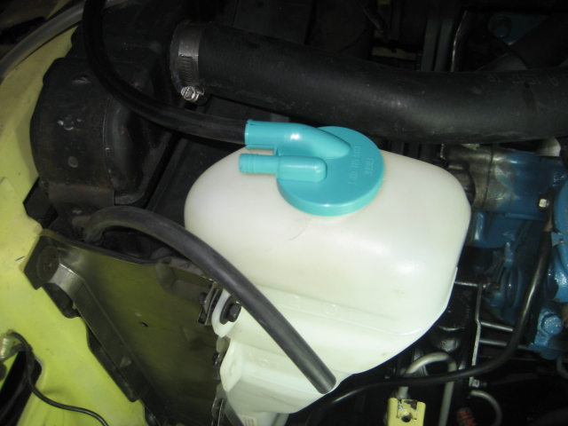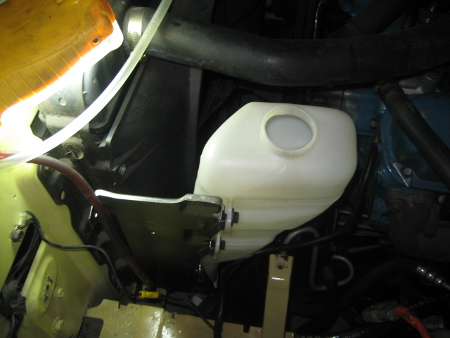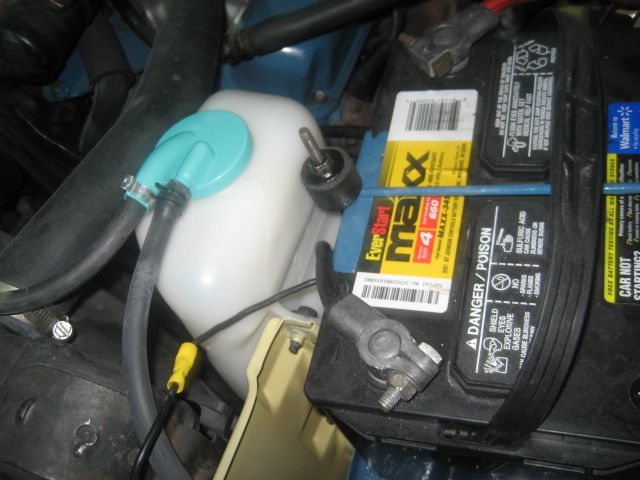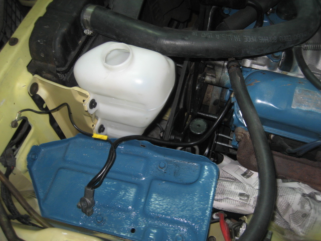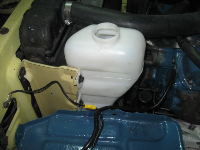 The old overflow tank was mounted on a piece of wood and set on the battery tray. I may get a another piece of hose and run it from the filler neck through the overflow lid and into the bottle.