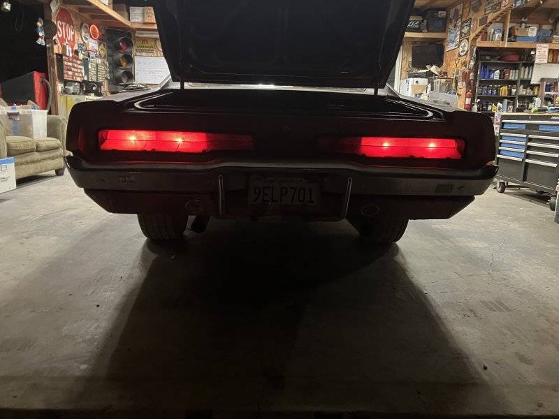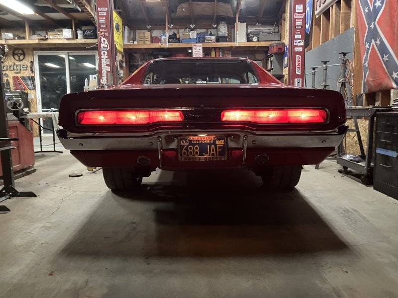 The Charger uses two 1157 bulbs for the tail, turn and brake lights and two single filament bulbs (I think #1095?) on the sockets nearest the license plate. Mine had a dead bulb on the left which gave a false impression of the difference in light. Here it is at night with no inner bulbs.Show us when it get's dark.