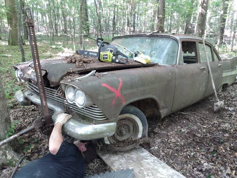 A few little tricks for you my keyboarding friend... When you go to pull this out use a few old junk steel rims, set them on the ground and run your cables, chains or straps across the top of them. They will provide some lift with the pull. I would also get a couple of 2-4 ton snatch blocks to run cable thru and chain too. Then use those to chain around the base of a sturdy tree to change the direction of your pull or change the direction of the car you must use cables in the snatch blocks.. Bring several bottles of soap too if you have trouble making it roll to easy loading on the trailer .. Take lots of pics and protect yourselves from ticks! Have fun!