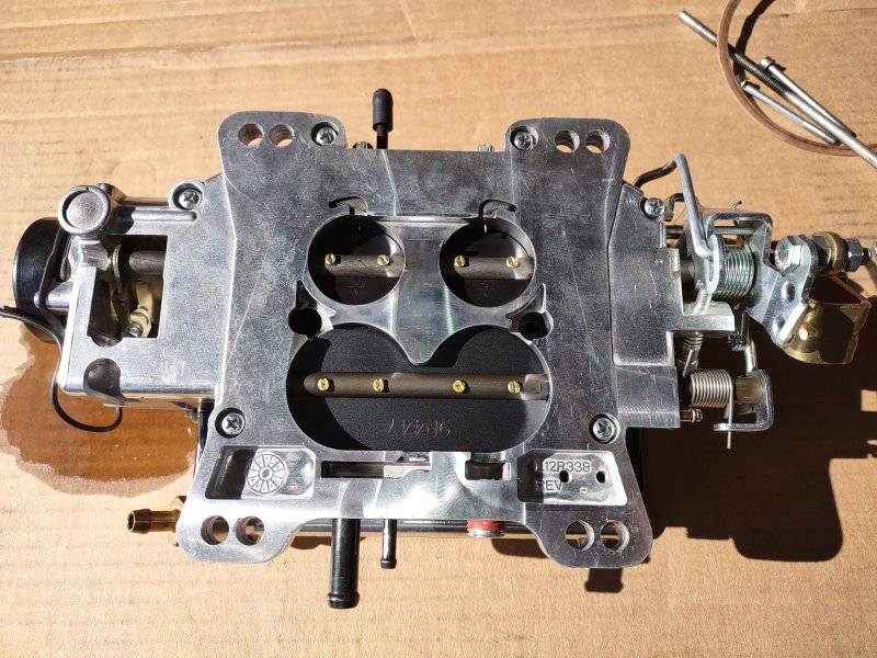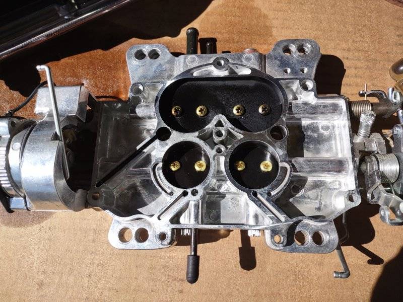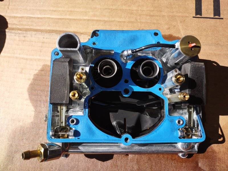 I changed the primary jets back to the 80's, and put in one step richer rods than stock. I am pretty sure that was the setup before I started messing with it on the dyno. I will check the plugs again after the 3 hour round trip to Moparfest next weekend. For those of you who have never seen inside a Street Demon, here are some pictures. Looks a lot like a Thermoquad.