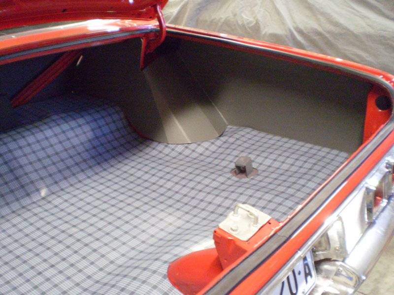 I made up some custom door cards for my Polara 4-door hardtop. The factory Canadian pieces were more like U.S. Belvedere cards; very plain. I once had a U.S. 4-door hardtop parts car, with red interior, and very good, fancier door cards. I masked off around the chrome mylar trims, and dyed the rest of the panels black. When unmasked, it left some of the original red colour, bringing a nice colour POP to the interior. I also used the longer front arm rest bases on the rear doors. I cleaned up the trunk area with preformed cardboard side panels available from Classic Industries. Canadian 1964 Dodge came with these, but U.S. cars did not. 1963 U.S. cars came with them, and the trunk area is the same, so they fit well. If you look up under the trunk weather strip side rail, there are likely hangers for them. Note that Canadian Dodge used convertible placement of spare tire for all their cars.