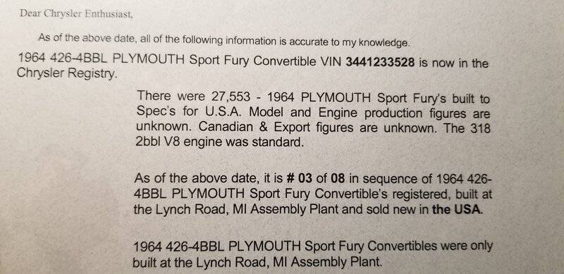 I see your car has the red/white/blue hubcaps as well. I have been trying to find out if that was an option on the Sport Fury or standard....Yours is only the 3rd car I have seen with them including mine. Annnnd, all 3 were 426-S cars. Your car appears to be either Chestnut Metallic or Sandalwood from the photo's.