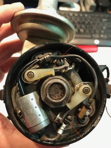 Just tried turning the distributor with the vacuum on and off of the advance, and I did not see any contact between the points arm and the screw.When the point arm opens is it touching the screw head and grounding? If so it will act like the points are actually closed. Think that is what HF is saying.