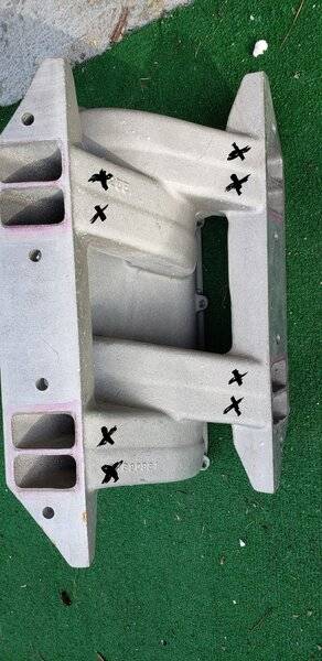Like this? (See X marks)I would look at putting the injector bungs on the bottom of the intake