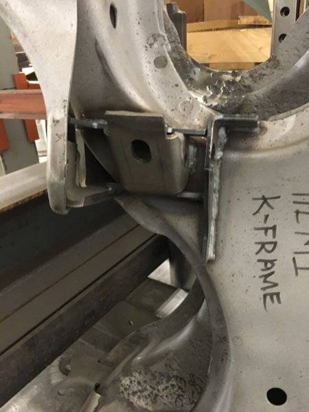 The passenger side is same as my 66. It looks like 70/71 K frame but don't know B or E. Driver side difficult no contrast. 70/71 driver's side eliminated bolt that came down from top. Looks like a hemi K member to me.