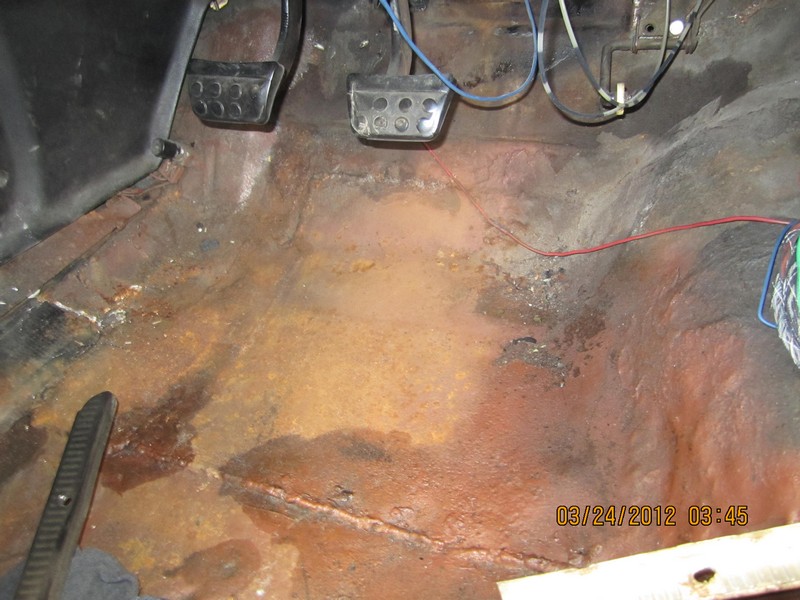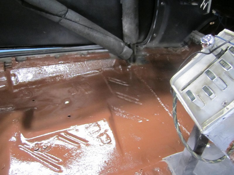 Before I did the install, I cleaned up and vacuumed the floor pan. There was some minor surface rust when I pulled up the old carpet so I used a fine wire brush to remove it and then used some Rustoleum rust reformer primer as a prevention from any continued rusting. I also ran speaker wires to the trunk for a planned hidden stereo upgrade down the road.