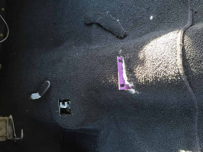 Hi guys- Here's some pics of my carpet install today. I used an ACC carpet with the mass backing. It is a very thick rubber backing bonded to the carpet and then it is form fitted to the floor pan. The quality was excellent. The backing was solid on the carpet and the fit was almost perfect to the floor pan. It was folded in the box and I was a little nervous about the form fit being ruined. I unfolded both sections and left them out in the driveway while I started removing the bucket seats, back seat bottom and shifter handle (seatbelts were already out). By that time, the carpets actually reformed into the shape of the floor pans. I started with the back section. As you can see in the pic, they leave a lot of extra on the edges that has to be trimmed. I used a double edged carpet knife, much better than a utility knife (no point to gouge the paint in the floor). I trimmed three times to get a nice fit up against the sill plates. The front was a lot harder. The extra carpet from under the dash, up against the firewall made it hard to get the carpet molded to the 4 speed hump in place. I had to slit sections, move the carpet up and to the side till i finally got the hump in place, then i slit it for the buddy seat bracket. Trimming under the dash was then not too bad. I used some of the felt insulation from the old carpet under the rear seat, as the carpet doesn't go more than 4" under. I figure it couldn't hurt. I got to reinstall the rear seat but didn't have time for the bucket seats, buddy seat, shifter bezel/boot, gas pedal and seat belts. Any suggestions on how to make the holes in the carpet for the seats to bolt thru? A drill will get twisted up in the carpet fibers.