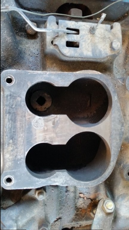 I have never seen one like that before...primary and secondary cut together...maybe each side fuels each bank on the motor? Not even sure what carb fits that.