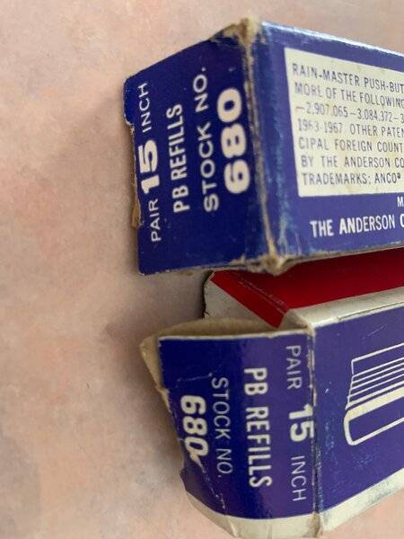 Very hard to find......I have several sets of NOS ANCO 15" 680 wiper refills. Correct for Red or Black push button blades used on many Mopars in the 60's and 70's. $29.95/pair shipped in the lower 48. Or, $22/pair shipped for 2 or more sets. I also have Trico LP-15 & LP-16 blades in both Trico and Texaco packaging for $20/pr shipped. PM me for more info. Joe