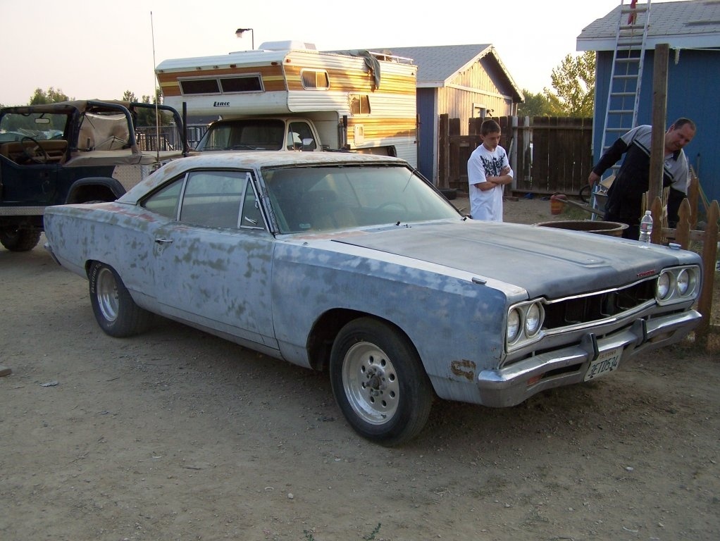 I figured I would share my current project. I have owned this car since 1992. Plan right now is to put a new motor in it and get it running to have some fun. It is ugly but has some good parts. The car is my 1968 Plymouth Sport Satellite. Original 318 auto car. Currently has a blown up 383 that spun a rod bearing 10 years ago and hasn't run since. Here is the rundown on the other good parts. 3.9 to 1 read axle with sure grip, 3000 rpm stall converter, headers with flowmaster mufflers 2.5 inch pipe, weld drag light wheels, Holley street dominator intake of manifold.