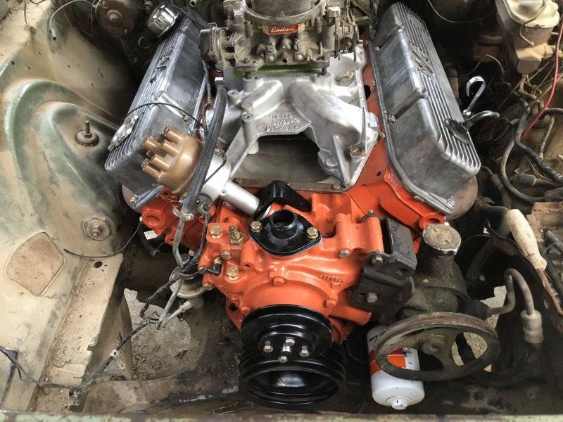 Started the car this weekend. Have a few hiccups though. Started easy and sounded healthy. Attempted to set timing by setting total timing. Unfortunately my timing light was not flashing consistently at 2000 rpm. So for now set by ear. Fuel is currently supplied from an external gas can as the tank needs to be cleaned out. Next hiccup came about 10 minutes into the break in when the radiator cracked and started leaking. So it is on hold while I repair a few items. Oil pressure is good idling at 50 and up to 80 when rpm is up. Sounds healthy.