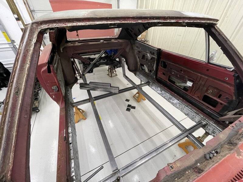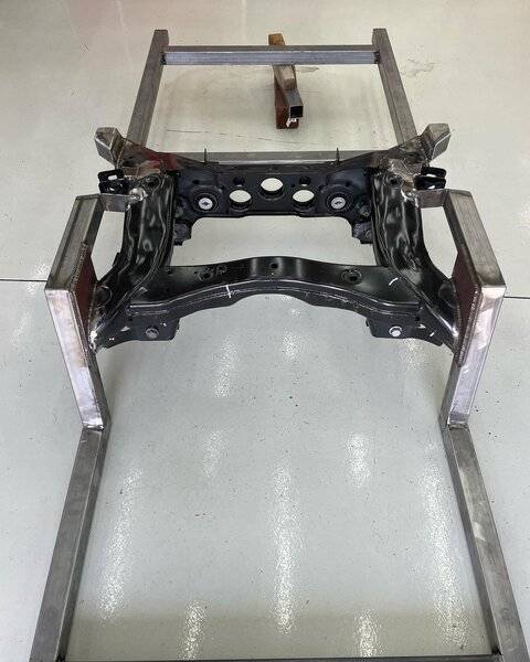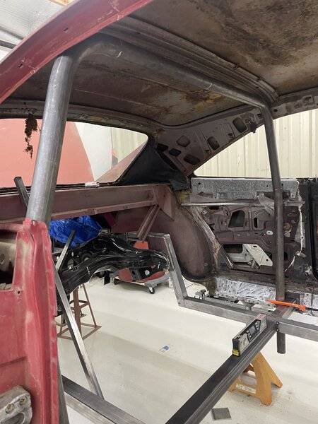 Got the rear section of frame in. Have not tied in to the rear crossmember as all the sheet metal is on indefinite back order. Front frame rails are tacked in. Working on the front crossmember at this time.