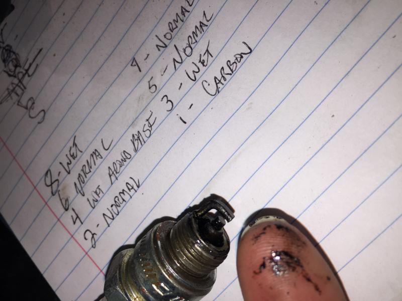 #2>I pulled out all the plugs and wrote down the conition (see attached picture). I also gapped them to .040, they were at .035. I pulled the #8 spark plug back out after my last attempted drive and it was wet again (shown in pic). I assume its oil.