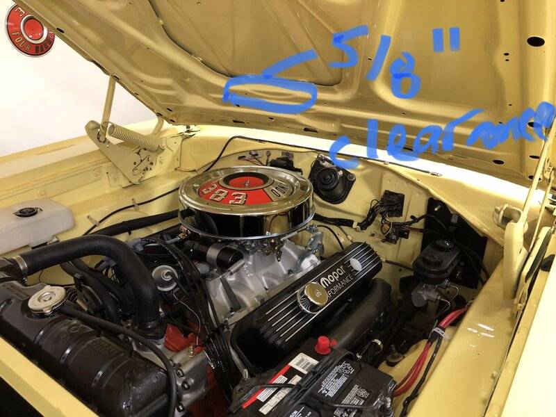 I have this set up but in a B motor which has 3/4” less deck height than the 440. I can use the stock Mopar performance unsilenced air cleaner & base, which in not a drop base in design, and also have to use a 2.25” tall filter in order to give the air cleaner enough hood clearance. This combo gives me 5/8” clearance at the tightest spot which is at the back of the hood where the curved cut is part of the design. The filter is a wix, don’t have the part number but if you look up a common Mercedes air filter that is the one. 13” x 2.25”. The stock filter height is 2.75” for your reference.